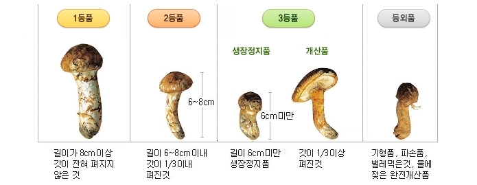 송이버섯을 채취하는 시점은 보통 자실체가 충분히 커진 후 수확하는 것이 좋습니다. 이때 갓(모자)의 가장자리가 아래로 향하는 상태에서 수확해야 최상의 식용상태가 됩니다. 좋은 상품으로 판매하기 위해서는 갓이 피지 않은 상태에서 수확해서 파는 것이 좋습니다. 대가 실하고 갓이 피지 않는 상태에 따라서 등급이 1등급, 2등급, 3등급, 등외, 혼합등으로 구분이 되고 가격이 형성되기 때문입니다.